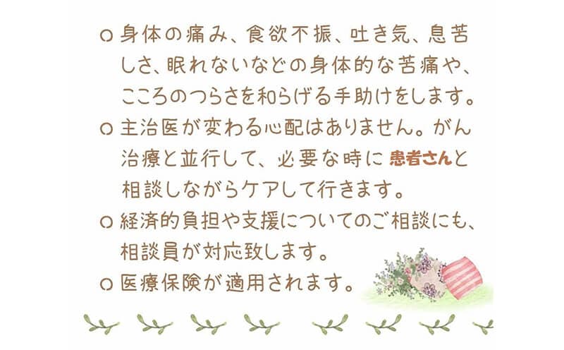 医師、精神科医師、緩和ケア認定看護師、薬剤師、ソーシャルワーカー、栄養士、理学療法士など多職種で構成された医療チームです。一般病棟に入院中の患者さんとご家族のからだのつらさ、気持ちのつらさ、経済的な問題など「生活していく上でのあらゆる問題」 について解決へ向けての支援を主治医や病棟スタッフと連携して行います。