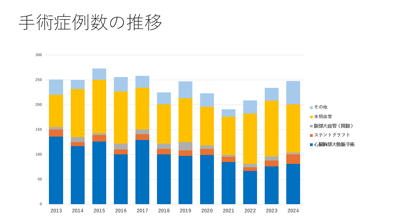 また、時代のニーズに合わせ患者さんに低侵襲な治療である大動脈瘤に対するステント治療や、傷を小さくして行う小開胸手術などにも力を入れております。