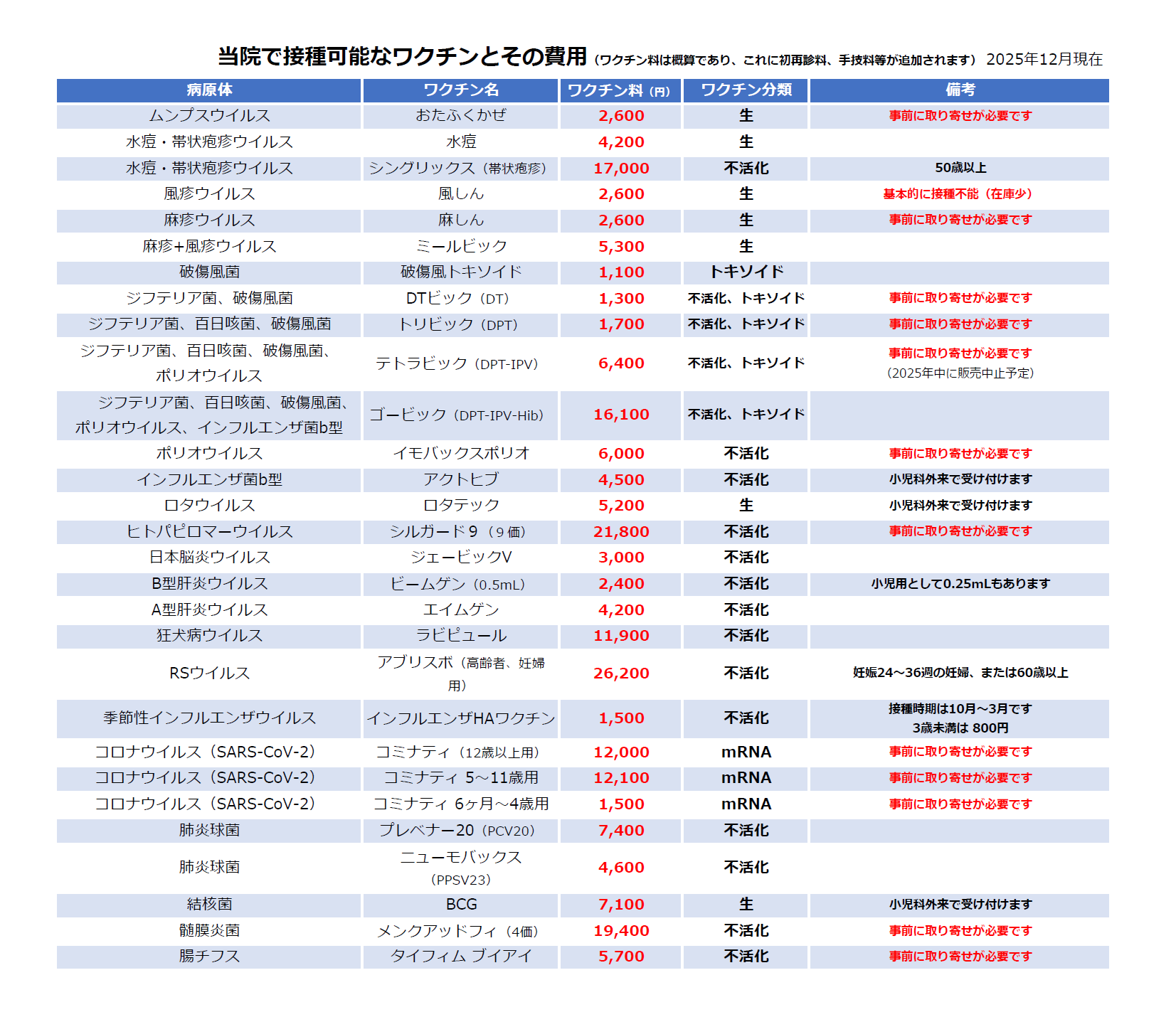 *ワクチン費用は概算であり、状況により変動することがあります。*ワクチン費用以外に実際の接種に際しては「受診料(初診または再診料)+処置料」が加算されます。