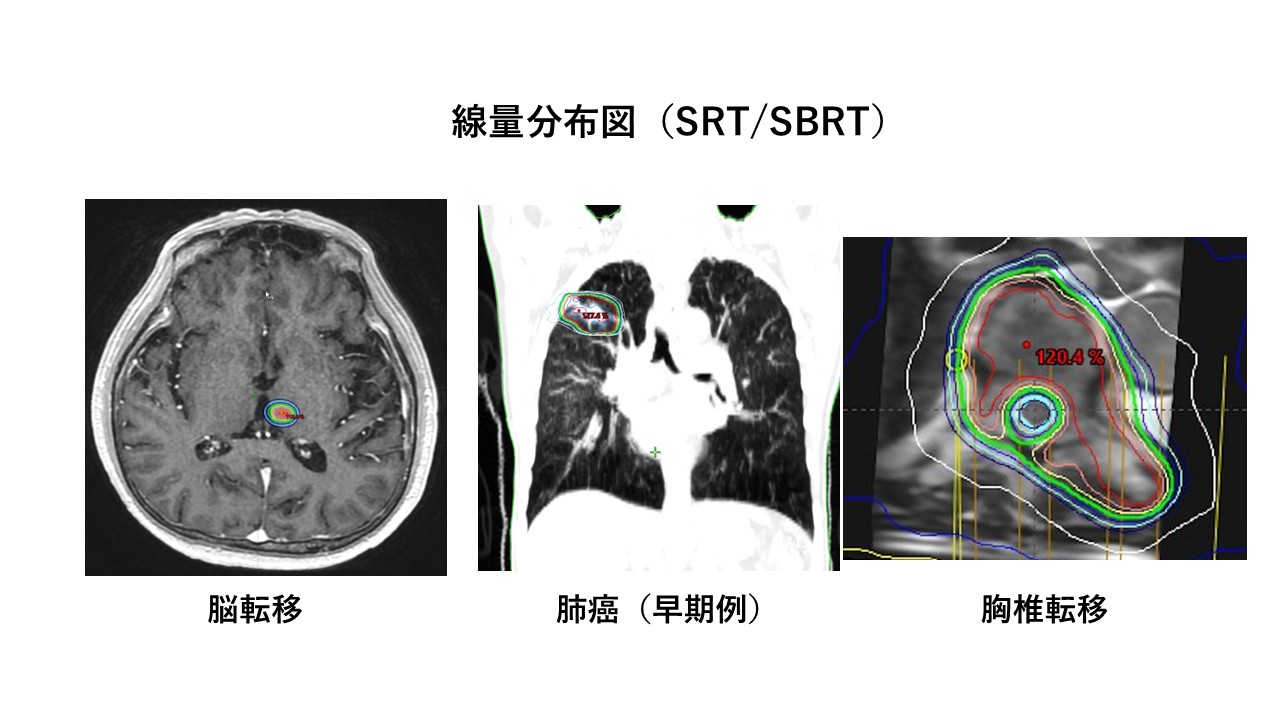 脳転移や、早期の肺癌や肝細胞癌などの体幹部の病巣に対して適用します(体幹部定位放射線治療:Stereotactic body radiotherapy: SBRT)。椎骨(背骨、腰骨)の骨転移には脊髄(神経)をくり抜くように避けての照射が可能です。