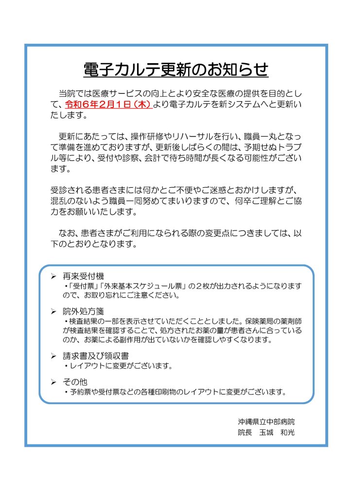 電子カルテ更新のお知らせとお願い(2024年2月1日開始)